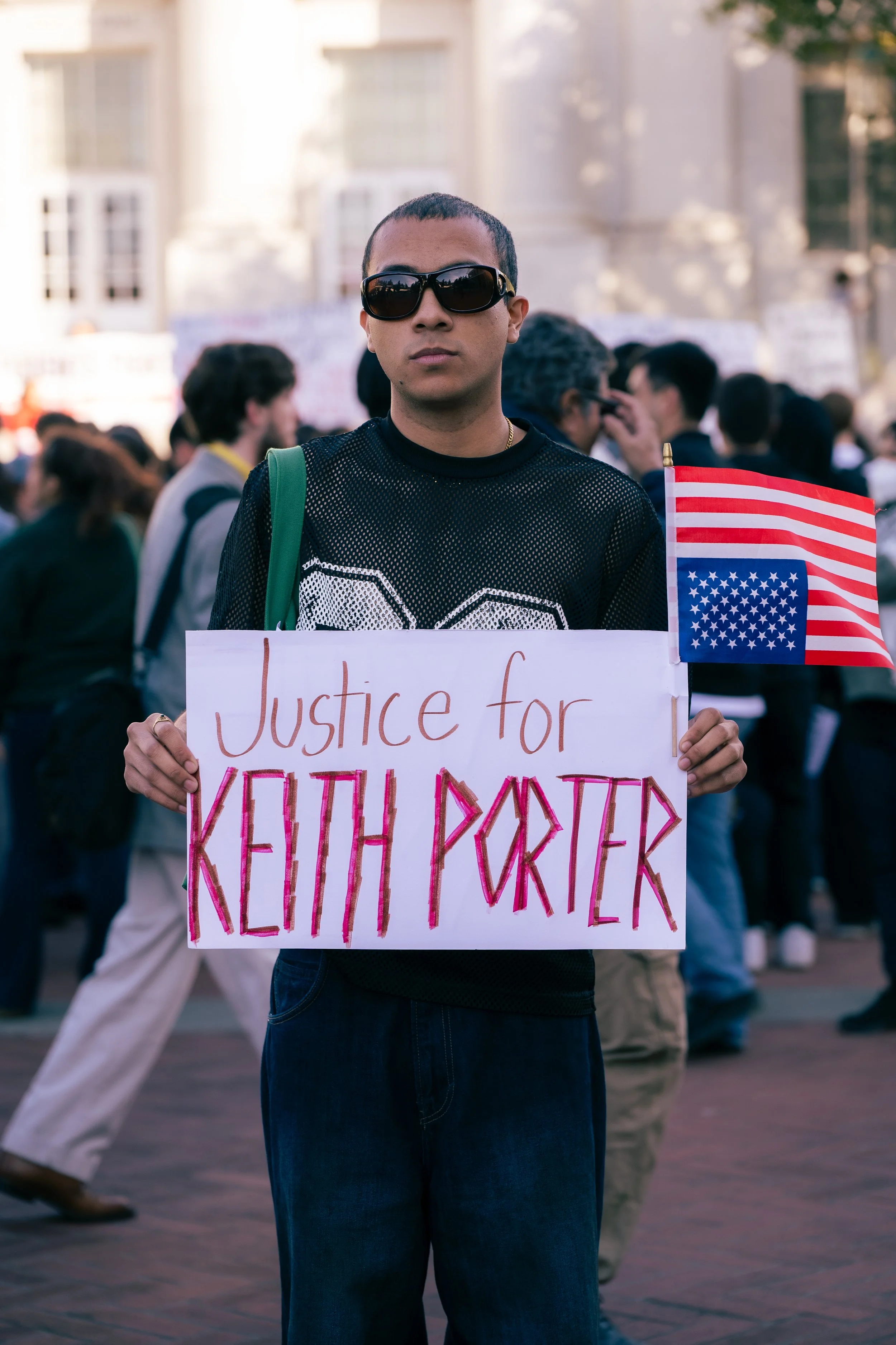 Jonathan was dressed in a black and silver jersey with an upside-down American flag, holding a sign which said “Justice for Keith Porter.”